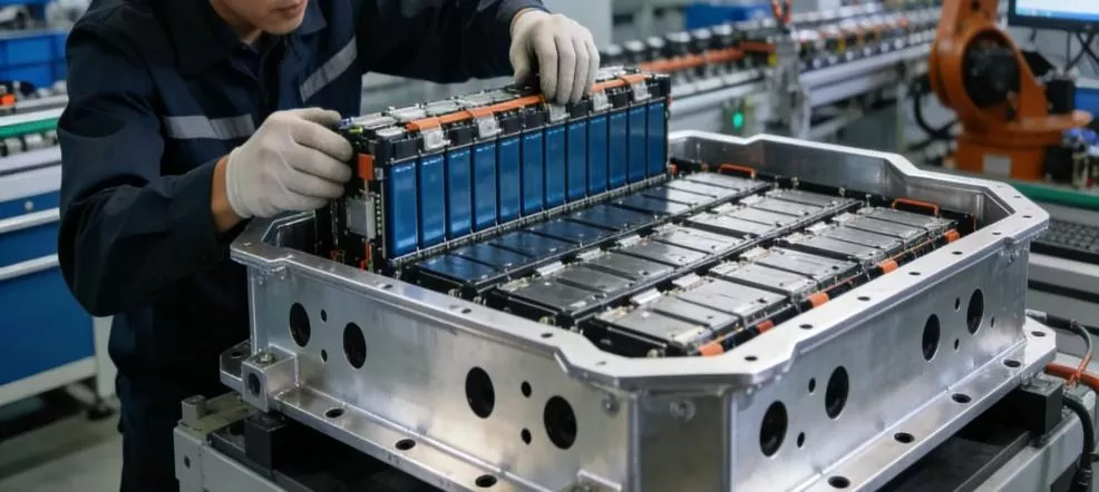 운송 부문: 신에너지 자동차 배터리 팩 프레임 조립 클로즈업