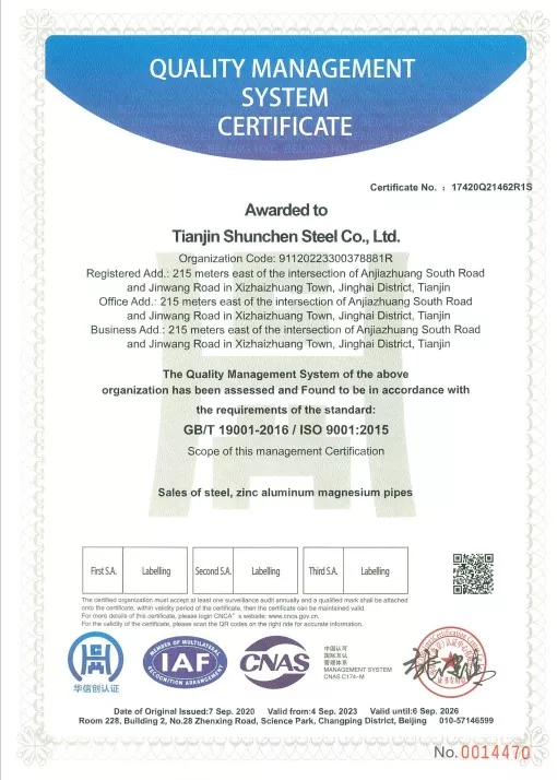 표준: GB/T 3091-2015 "저압 유체 운송용 용접 강관", GB/T 13912-2020 "용융 아연 도금 강철 튜브". 이 제품은 제3자 테스트를 통과했으며 테스트 보고서가 있습니다.