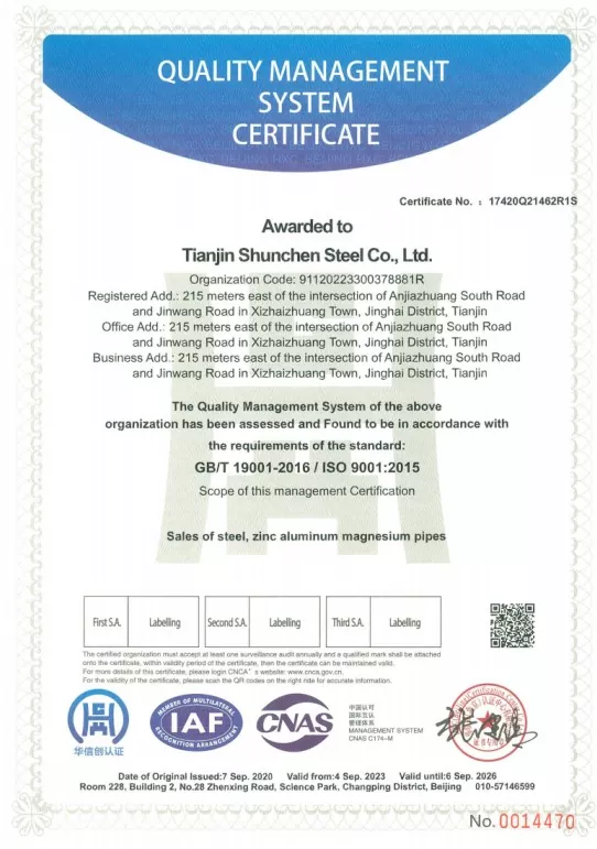Tianjin Shunchen Industrial Company는 철강 산업에서 30년 이상의 생산 경험을 축적해 왔습니다. 회사는 ISO 9000, 3A 시스템 인증은 물론 유럽 연합의 CE 인증을 보유하고 있으며, 아연도금 가공부터 판매, 유통까지 전체 산업 체인 레이아웃을 구축했습니다. 엄격한 12단계 프로세스 흐름과 3단계 종합 검사 메커니즘을 통해 회사는 12년 연속 연간 품질 및 안전 사고 제로와 주문 불이행 제로 기록을 달성했습니다. Shunchen Industrial은 연중 20,000톤이 넘는 아연 도금 강철 현물 재고를 유지하여 창고와 유통을 통합하는 대규모 아연 도금 강철 슈퍼마켓을 형성하고 있습니다. 창고 면적은 10,000m2로 통합 생산 및 판매 서비스를 위한 견고한 지원을 제공합니다.