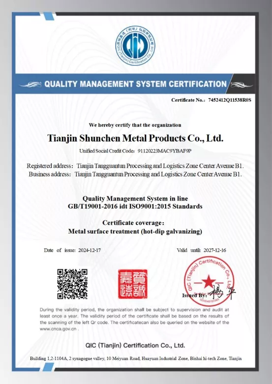 신뢰할 수 있는 품질을 원하시면 Shunchen을 선택하세요. 우리는 내식성을 위해 용융 아연 도금 처리된 Q235B 또는 Q355B의 고품질 강철을 사용합니다. 아연 냄비의 온도는 섭씨 450~460도 범위 내에서 정밀하게 제어되어 아연 코팅의 강한 접착력을 보장하고 누락된 부분이 없도록 합니다. 당사의 제품은 ISO9001 품질 시스템 인증을 준수하며 제3자 아연 코팅 검사 보고서의 뒷받침을 받습니다.